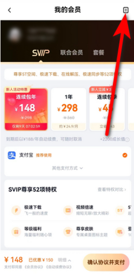 2、然后跳转到我的会员页面,点击右上角的【订单记录】按钮;