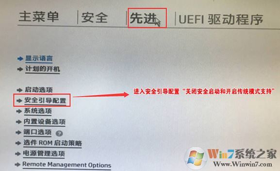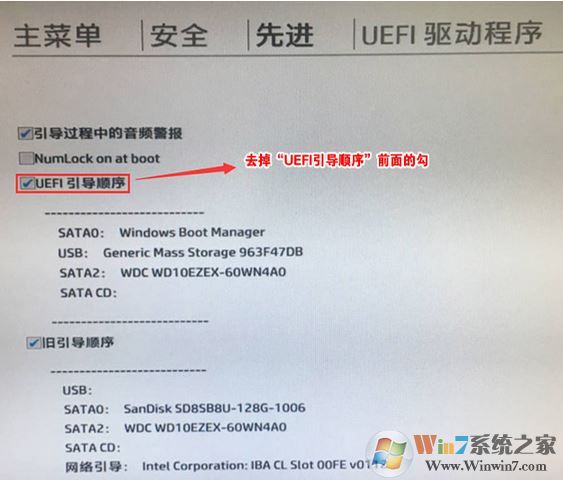 6、进入后,去掉UEFI顺序前面的勾,让机器默认为传统启动,这样会方便WIN7的安装,如下图;