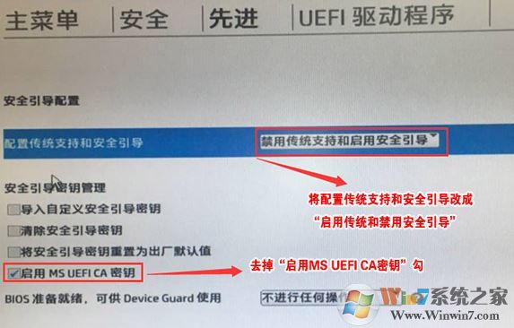 3、按Enter键后,将计算机的遗留支持和安全启动设置配置为“启用遗留支持并禁用安全启动”并取消选中“启用MS UEFI CA密钥”,然后按F10保存更改;