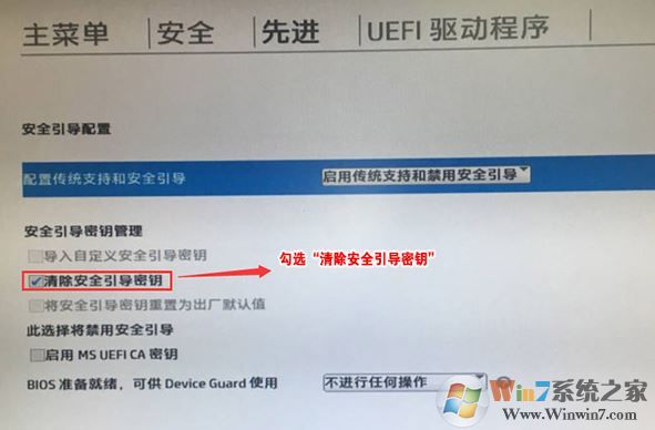 4、F10保存并重启,然后再次打开电脑按ESC,然后选择F10进入BIOS设置。进入刚才设置的地方,勾选“清除安全启动密钥”,然后F10再次保存;