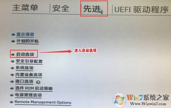 5、F10保存重启后,再次打开电脑按ESC,然后选择F10进入BIOS设置,将鼠标移至“高级”选项,选择“启动选项”回车进入,如图如下图;