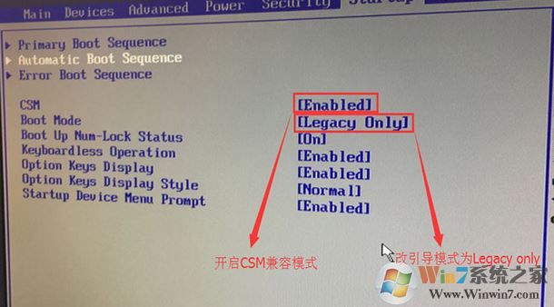 3、切换到Boot,将Boot Mode从UEFI改为Legacy only boot模式,然后将csm默认disabled改为enabled,开启兼容模式,选择F10保存设置,在弹出的选项中选择YES;