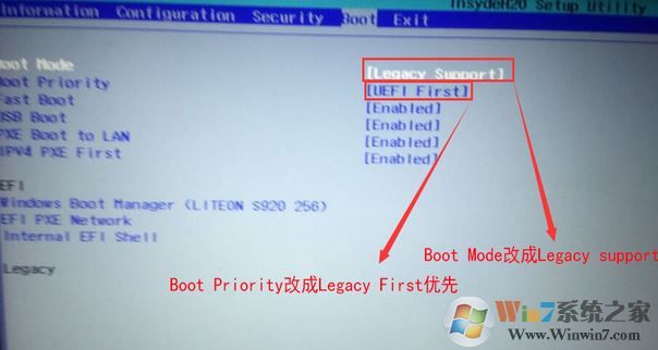2、进去切换BOOT选项,将Boot Mode从默认UEFI改为Legacy Support,然后将Bootpriority从默认UEFIfirst改为Legacyfirst,并更改legacy正常启动优先级;