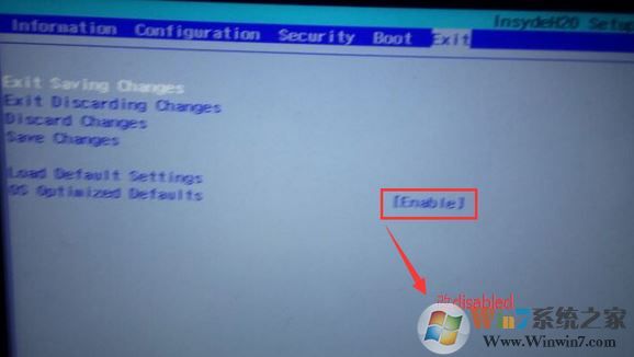 3.然后切换到Exit选择并将os optimization defaults从默认启用更改为禁用;