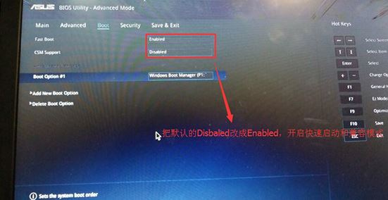2、重启后切换到BOOT选项,将fast boot和csm support由disabled改为enabled,分别启用fast boot和兼容模式,如图:
