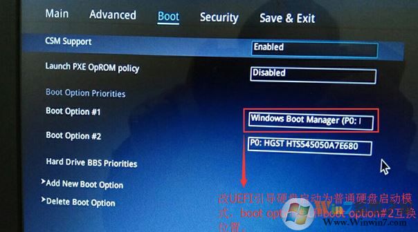 3、继续将boot option#1选项改为正常启动,交换boot option#1和boot option#2的硬盘启动位置,将第一个启动项设置为正常硬盘启动,并使用Windwos Boot Manager启动UEFI启动分区;