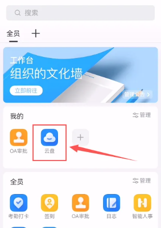 2、然后在工作台页面选择【云盘】服务功能;