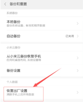 4、最后进入备份重置功能页面,点击【恢复出厂设置】确认取消耳机模式。