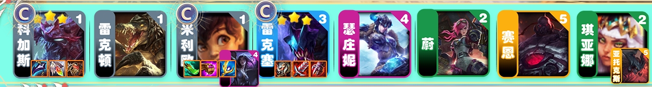 人口8,去塔恩开6战士,弥补卡莎的质量。同时,当D三星雷克赛达到5级时,可以用米里奥换卡莎,用奇亚娜换剑魔/大头D,卡莎无法使用。沙皇/船长/狐狸。