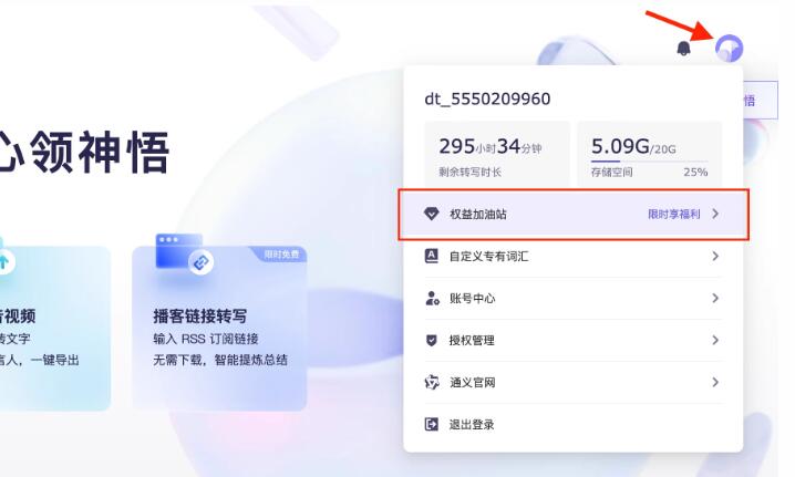 1、首先进入网站,点击右上角头像,然后点击权益加油站。