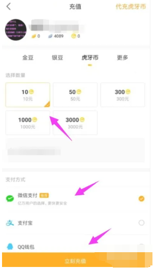 5、最后选择您需要充值的虎牙币数量,并勾选支付方式进行充值。