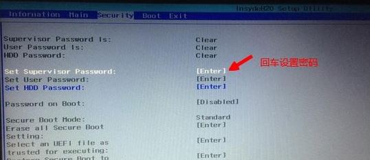 2. 关闭安全启动以禁用。当设置为“旧版”时,安全启动默认处于关闭状态。如果Secure Boot为灰色且无法设置,请进入Security,选择Set Supervisor Password并按Enter键设置密码,然后禁用Secure Boot,如下图所示;