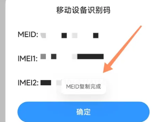 3、最后长按移动设备识别码上的【imei码】即可复制成功。