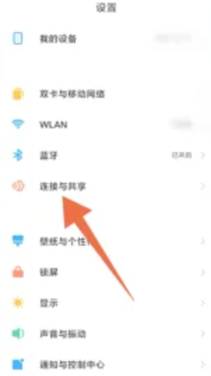 1、首先打开小米手机的【设置】功能,选择【连接与共享】;