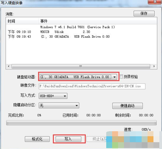 4、此时会弹出“写入硬盘镜像”窗口。确认磁盘驱动器是您的USB 闪存驱动器后,单击“写入”。中间会弹出格式化提示。我们只需要确认一次就可以了。
