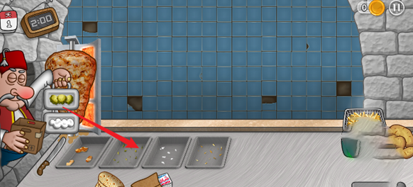 1、我们先进入制作台,然后点击左边的老头,将土豆切成条状,放入油锅中。