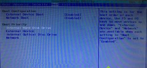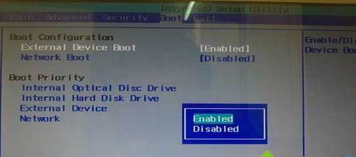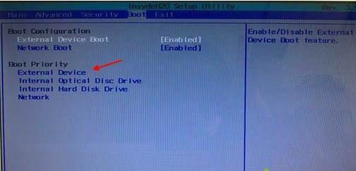 3、切换到Boot,如果有Boot Mode,则改为Legacy,并将External Device Boot设置为Enabled;