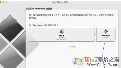5.进入Mac硬盘分区界面。在这里您可以手动调整Windows系统的硬盘空间。我建议这里划分成一个较大的尺寸,如果你主要使用Win7系统,因为还有存储文件,如图:
