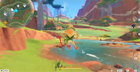 3、互动结束后,宝龙附身,再次向西南方向靠近河流。