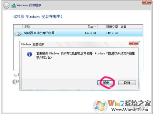 3、分区程序会自动划分一个保留分区,Win7为100M,Win10为500M。 (启动分区是隐藏的。)我们可以点击确定;