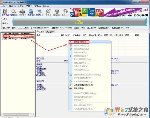 1、运行DiskGenius,如下图所示。在左侧,选择新硬盘。您可以看到上部显示一个空闲的灰色条。右键单击灰色条并选择创建新分区。