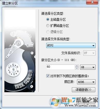 2. 分区有两种类型。如果是安装系统的分区,必须选择主磁盘分区。选择您想要的分区大小。重点是对齐并勾选“到下列扇区数的整数倍”,然后点击下面选择4096作为扇区数然后确认