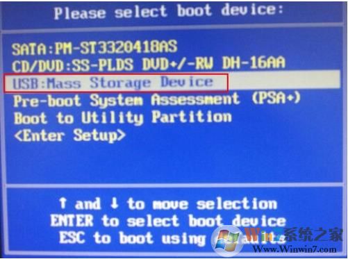 2. 按启动快捷键后,系统进入启动项选择窗口。使用键盘上的上下方向键选择要启动的U盘。 USB开头的是插入的U盘。按Enter键确认,如图: