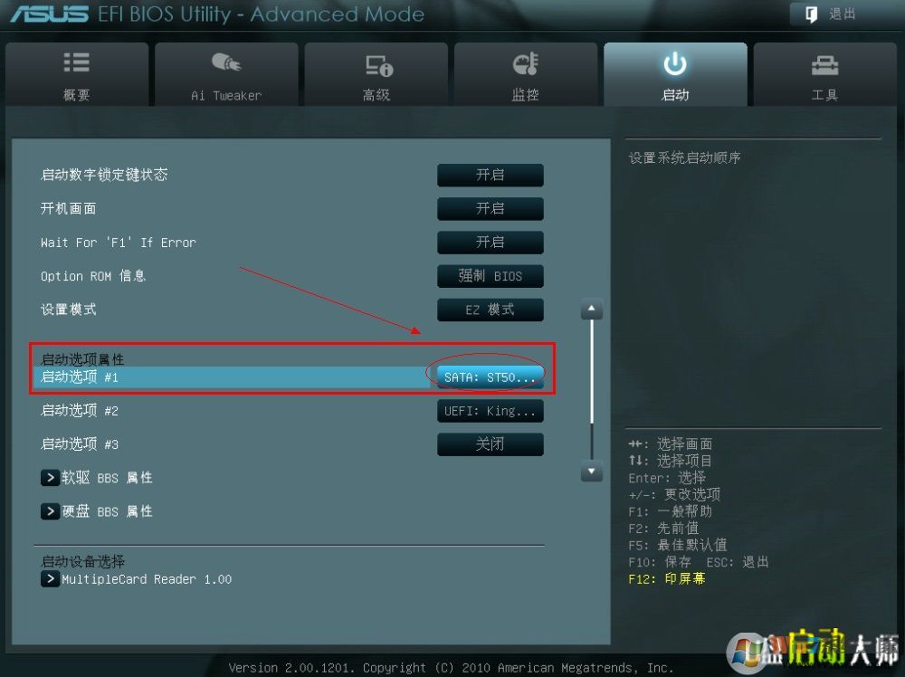4. 按Enter 确认后,会弹出如下所示的“Startup Option #1”选择菜单。按键盘上的“上下方向键”切换到“U盘”,与方法1相同。