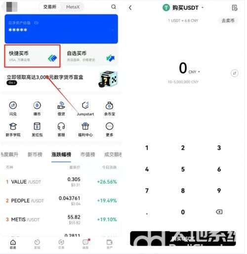 【新用户注册:点击立即进入】第一步:打开欧易APP,点击首页快速购币按钮,进入购币页面。