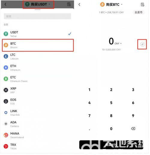 步骤2:将购买币种切换为BTC,并输入金额/要购买的金额。点击如图按钮即可完成“按金额购买”/“按币量购买”之间的切换。