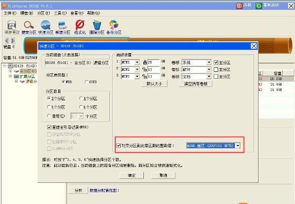 (1.) 打开Diskgenius,进入主界面。您可以使用快速分区并选择4个分区。 C盘一般设置为100G。其他驱动器都是免费的。毕竟win10还是需要多预留一点C盘空间的。如果是固态硬盘,建议勾选“将分区对齐到该扇区的整数倍”,然后选择“4096”,然后确认分区,这样分离出来的磁盘就是4k对齐的磁盘。