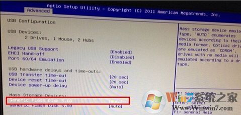 3、在弹出的界面中,使用上下方向键选择“Generic Flash Disk 5.00”,按Enter键确认。如下图