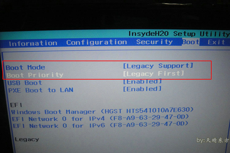 3.如图所示更改红框中的选项。注意:先更改第一个启动模式,然后才会出现第二个启动优先级。