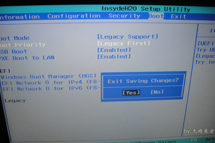 4.更改后,按F10,会出现对话框,然后选择是,计算机将自动重新启动。重新启动后出现Lenovo徽标时,按下开关,计算机将关闭。
