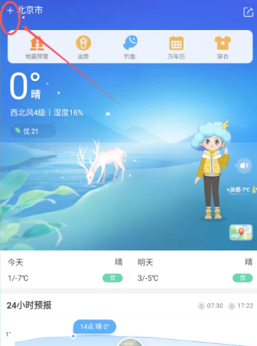 2、然后在下图所示的天气情况页面,选择左上角的【+】图标,点击;