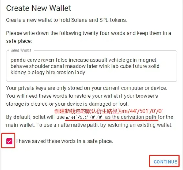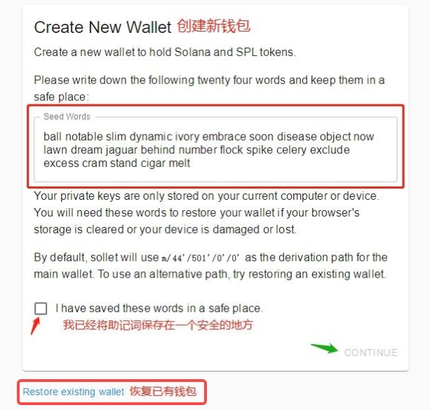 复制并保存助记词后,点击左下角红色箭头标记的框,然后点击“继续”按钮,完成钱包创建的初始设置。