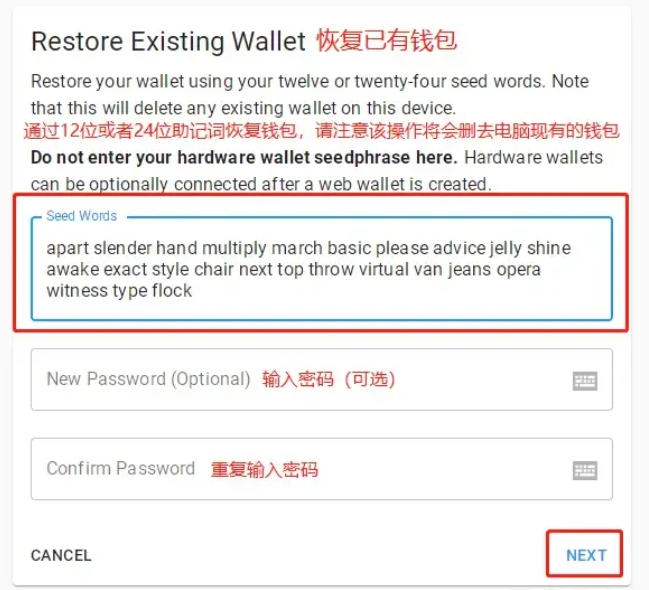 在导入助记词界面,将之前保存的(12位或24位)助记词准确输入到红色框中。然后,设置并确认钱包密码两次,以确保安全。单击“下一步”继续。