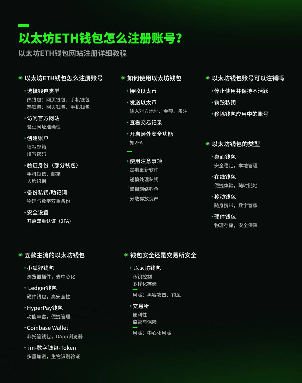 如何注册以太坊ETH钱包账户1.选择钱包类型在注册以太坊ETH钱包之前,用户首先需要决定使用哪种类型的钱包。主要分为热钱包(如网页钱包、手机钱包)和冷钱包(如硬件钱包)。热钱包使用方便,适合日常交易;冷钱包安全性更高,适合长期存储大量资产。下面以网页钱包为例,介绍如何注册以太坊ETH钱包账户。