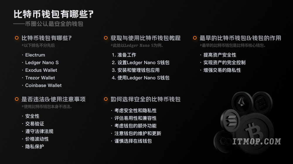 比特币钱包是什么比特币钱包是一种用于存储、管理和交易比特币(BTC) 的数字工具。它与传统钱包类似,但它存储比特币等数字资产而不是实物货币。以下是五款主流的比特币钱包: