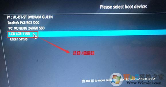4、插入U盘启动盘,重启后按ESC选择识别到的U盘启动项,按回车;