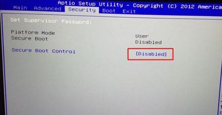 神舟战神Z6-KP5D1 安装win7旗舰版图文教程步骤二:1. 重新启动笔记本,按F2进入BIOS设置,将Security下的Secure Boot Control设置为Disabled,如图: