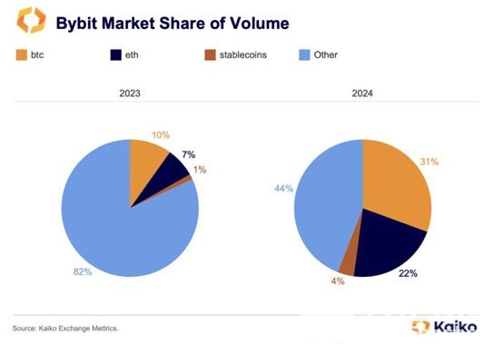 报告分析称,Bybit交易量增长主要由BTC和ETH推动,其市场份额自去年以来从17%上升至53%。相比之下,币安的山寨币(altcoins)交易量大幅增长。如下图所示,Bybit主要币种交易量大幅增长。