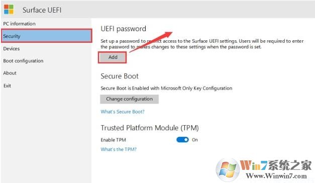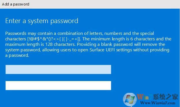 2。输入BIOS接口后,我们首先向下移动到安全性(安全选项),然后在右侧向UEFI密码添加密码。在向UEFI启动Surface设备时,我们必须输入此密码。密码可以包含以下字符:大写字母:A-Z小写字母:A-Z特殊字符: @$^ *()? {} [] -_=+ |。''密码必须至少为6个字符并且对案例敏感,如下图所示;