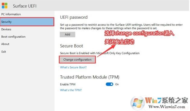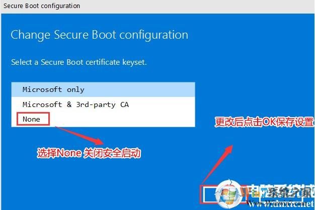 3.返回安全性(安全选项),输入右侧的更改配置并输入安全启动设置,然后将安全的启动配置更改为NOE以关闭安全启动(安装Win7系统时必须关闭),如下图所示;