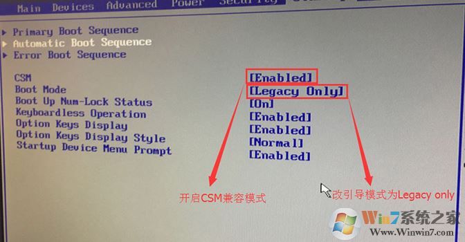 3。切换到启动,将启动模式从UEFI更改为仅遗留启动模式,然后更改default disabled启用,启用兼容模式,选择f10以保存设置,然后在弹出选项中选择“是”;