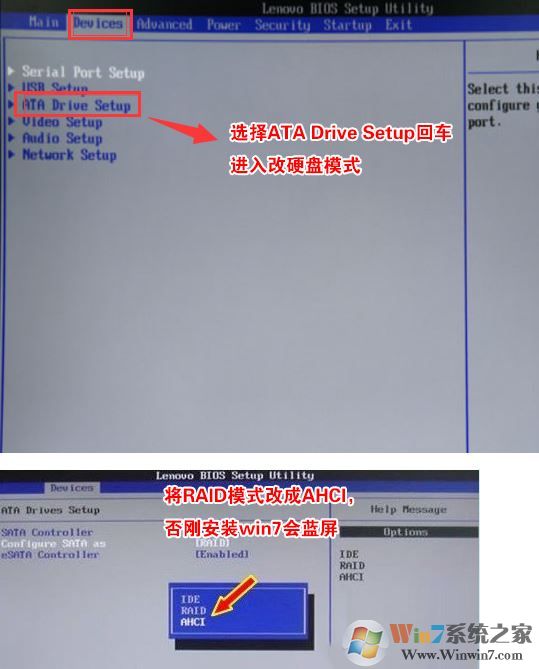 4。切割键盘以移动设备选项,按键盘移动ATA驱动器设置,然后更改ACNA中的SATA中的默认RAID,以将其视为AHCI模式。否则,安装Win7时将出现0x0000007b蓝屏,因为Win7中没有集成的RAID硬盘驱动器,然后选择F10保存设置,然后在弹出选项中选择“是”,如下图所示;