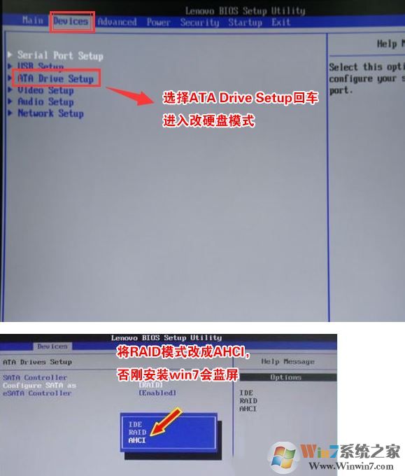 4。移动键盘左箭头中的设备选项,将ATA驱动器设置移动以输入,然后更改configure SATA中的默认突击量为AHCI模式。否则,安装Win7时将出现0x0000007b蓝屏,因为Win7中没有集成的RAID硬盘。驱动程序,然后选择F10保存设置,然后在弹出选项中选择“是”,如下图所示;