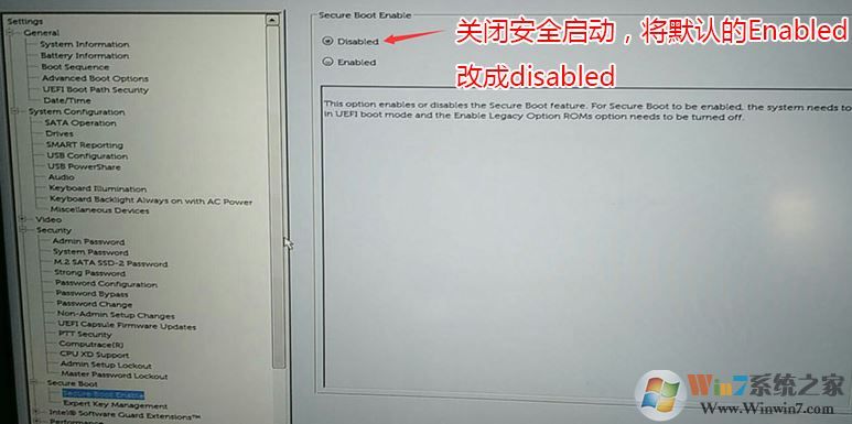 戴尔DELL成就Vostro 3669 U盘安装步骤二:BIOS修改与U盘启动1。按F2打开计算机时,按F2输入BIOS,按F2输入BIOS接口,切换到安全启动页面,选择Secure Boot enable启用并按Enter键以更改为禁用,请关闭安全启动,否则,启动在安装Win7后会失败,如图所示。