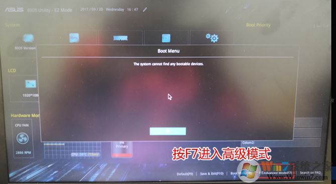 华硕R421UN重装win10专业版步骤二:BIOS修改与U盘启动1。重新启动笔记本,然后按ESC进入BIOS设置,然后按F7进入高级模式,如下图所示;