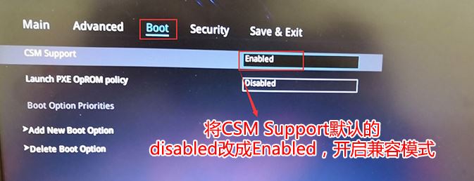 3。重新启动后,切换到启动选项,将快速启动和CSM支持从禁用到启用,并分别启用快速启动和兼容模式;
